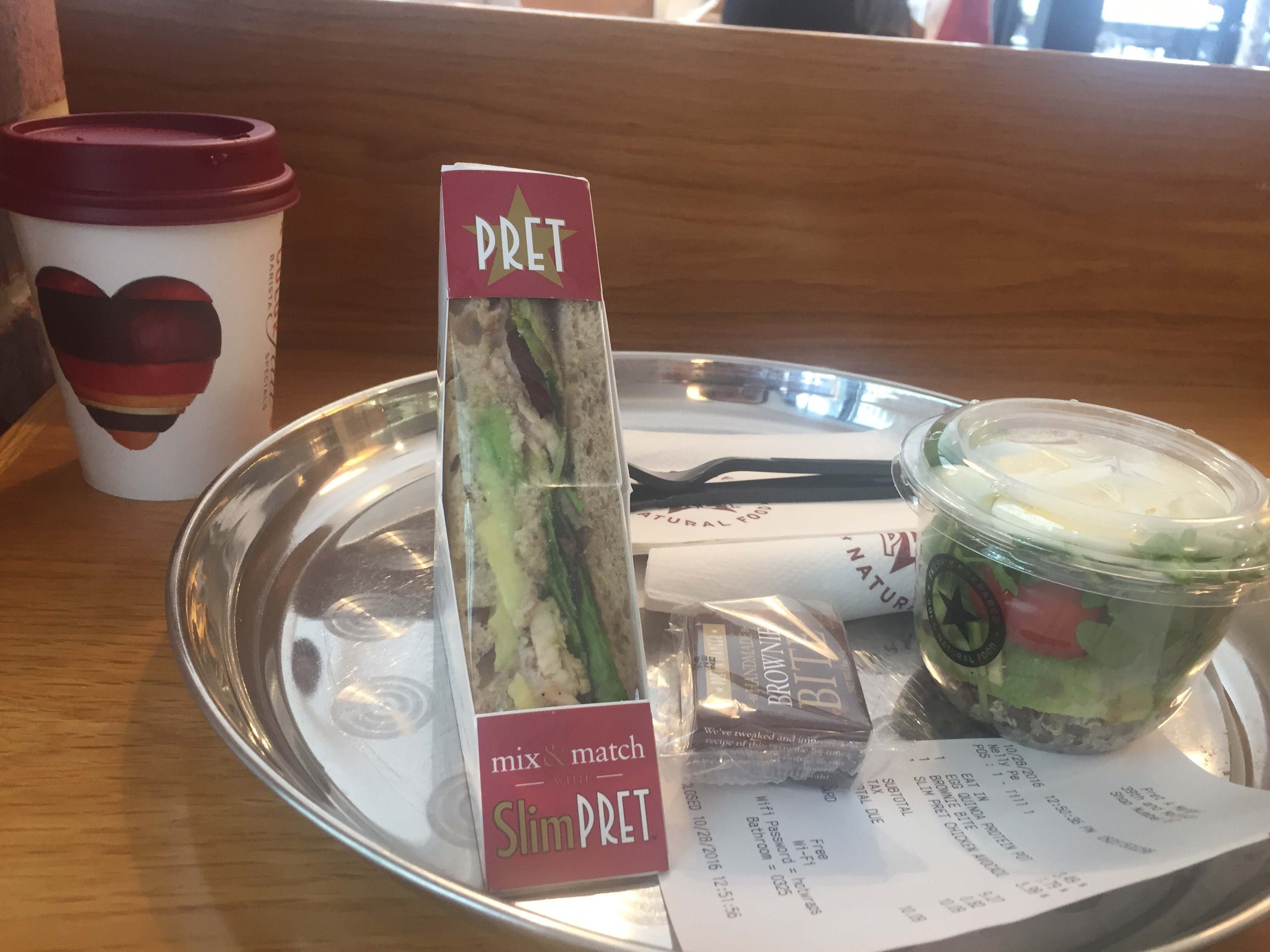 I bought a Slim Pret Chicken Avocado sandwich (one half, not two halves of a sandwich, a egg, spinach and quinoa protein bullet, a brownie bite, and a burnt sugar latte with soy milk.