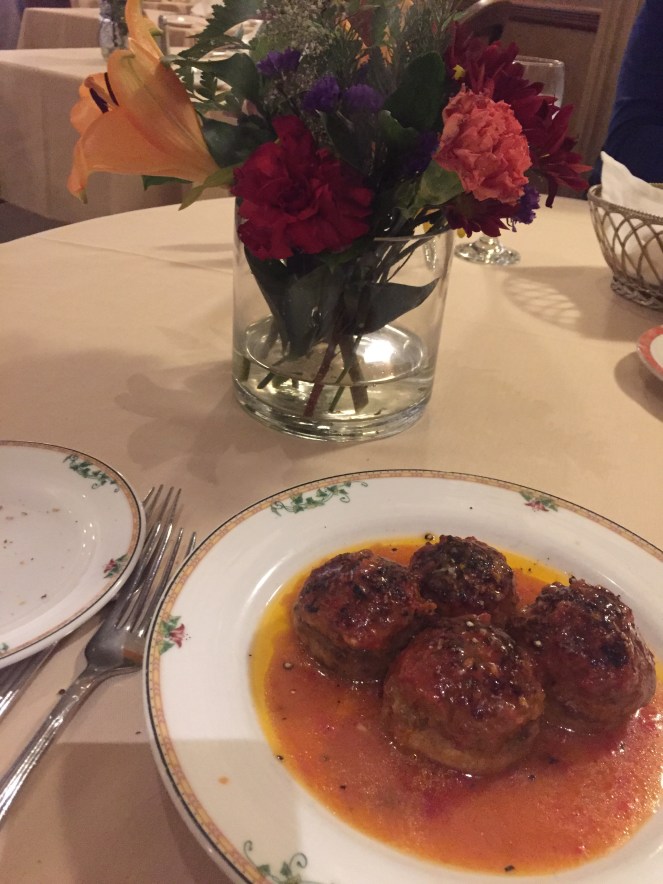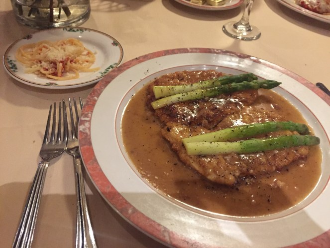 The main course was Chicken Martini, which I never tried out or have heard of previously. (I need to really brush up on my Italian dishes). Anyway, the first bite was heaven. The chicken was succulent, fried lightly in batter (not crispy like Thea’s and Camille’s Parmigiana) and drenched in a sherry-rich sauce, dressed with asparagus. (I also tried some spaghetti from Camille’s plate. It was fine, as pasta should be. The marinara luckily didn’t overpower the noodles).