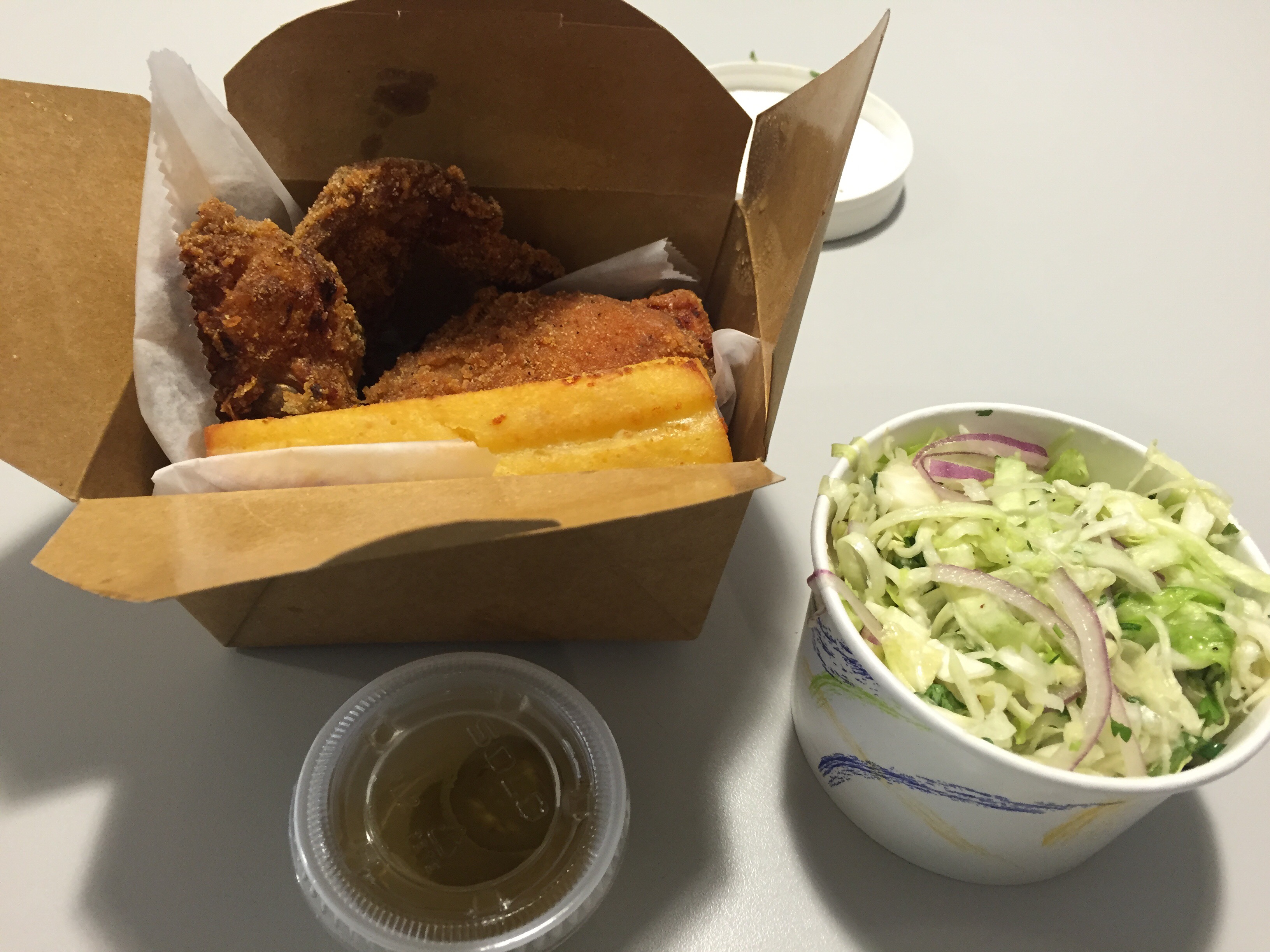 “Always fresh, always fast!” is the main tag on the menu, with chicken “all natural & antibiotic free.” Okay then, we’ll see. I ordered 2 pieces of fried chicken (comes with cornbread & a side of jalapeno vinegar) and a side of coleslaw. Meal without 1 side: $7.00. Total price w/ 1 side = $11.00.