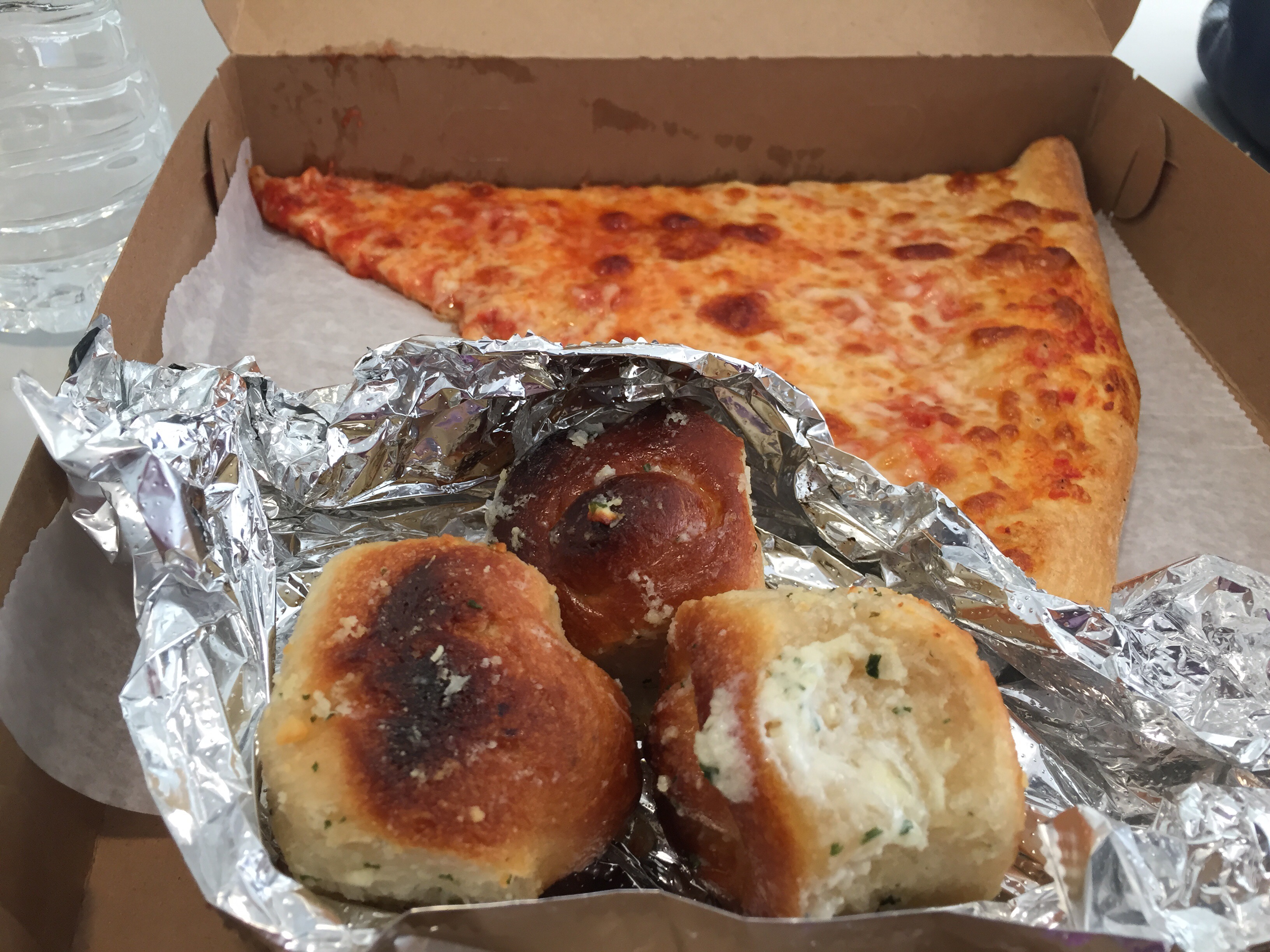 Weird…At the library, at least 3 people also got pizza today. It’s almost a growing trend. Also I’m saving some bucks; payday is Friday. I bought a plain slice (No mushrooms? Denied!) and 3 garlic knots for $1.50. Total price w/ drink: $5.25. Not bad.