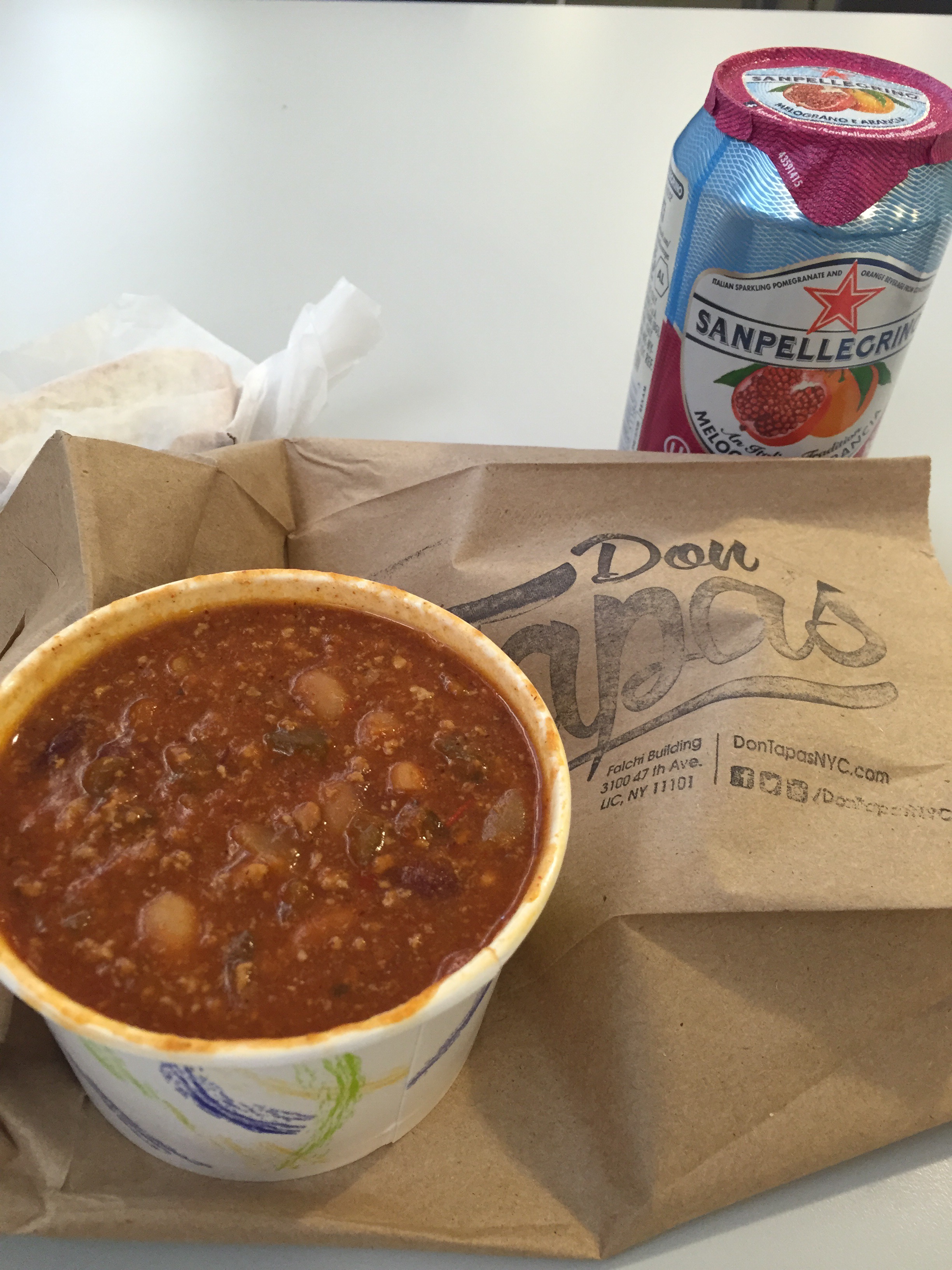 Today’s soup, courtesy of Don Tapas, is beef chili. This chili is hardy, full of beans, a rich tomato-based sauce with plenty of beefy goodness. This spice blend was mild, not too pungent, and accessible for most palates. I liked the fact that it was served plain, without cheese and/or sour cream. The toasted baguette piece accompanying it was unsubstantial; I rather prefer to get some of their crisp bread (it’s like a fancy chip).