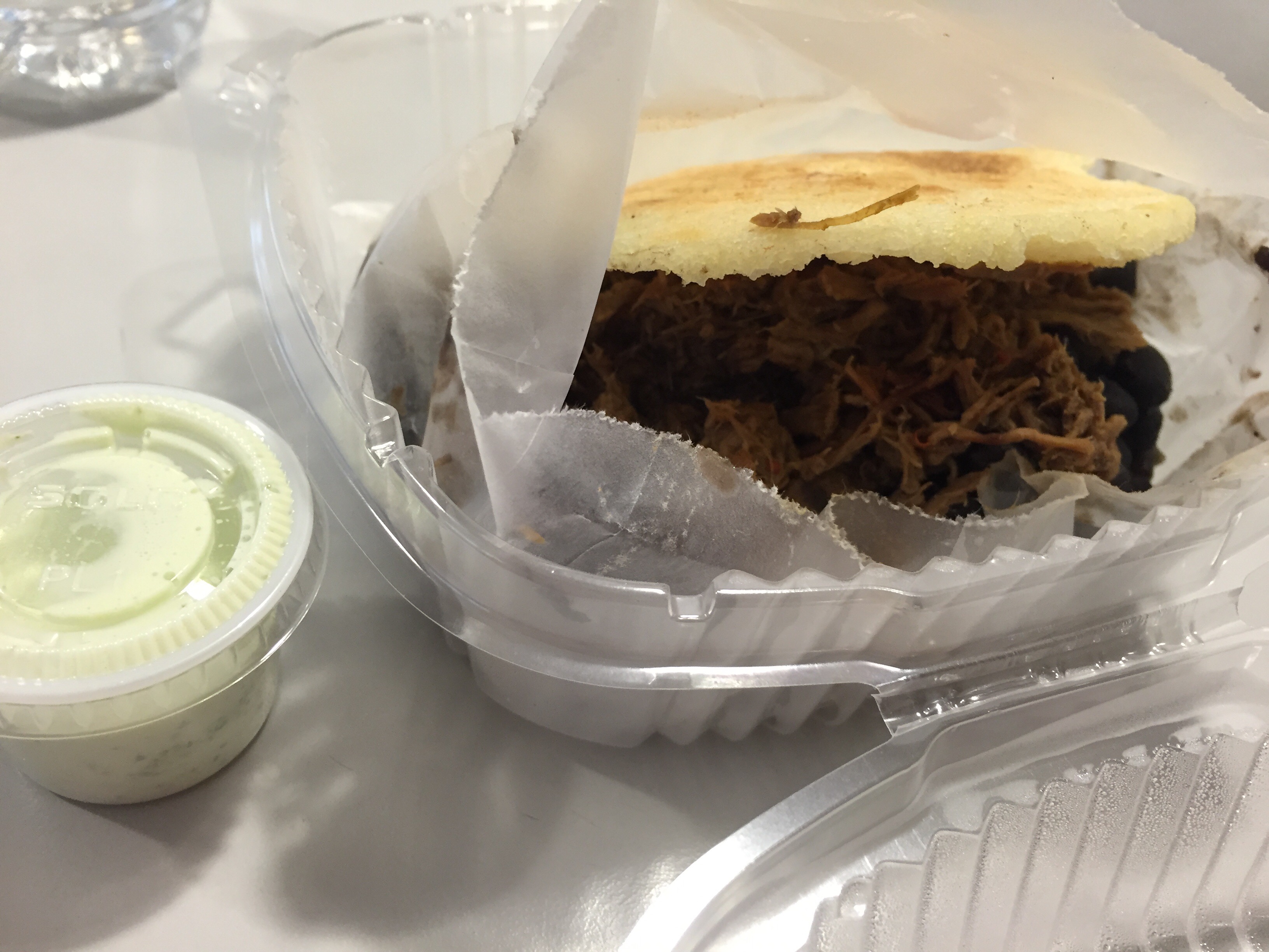 I ordered mine with shredded beef and black beans, with a side of verde sauce. The arepa was freshly grilled to order.