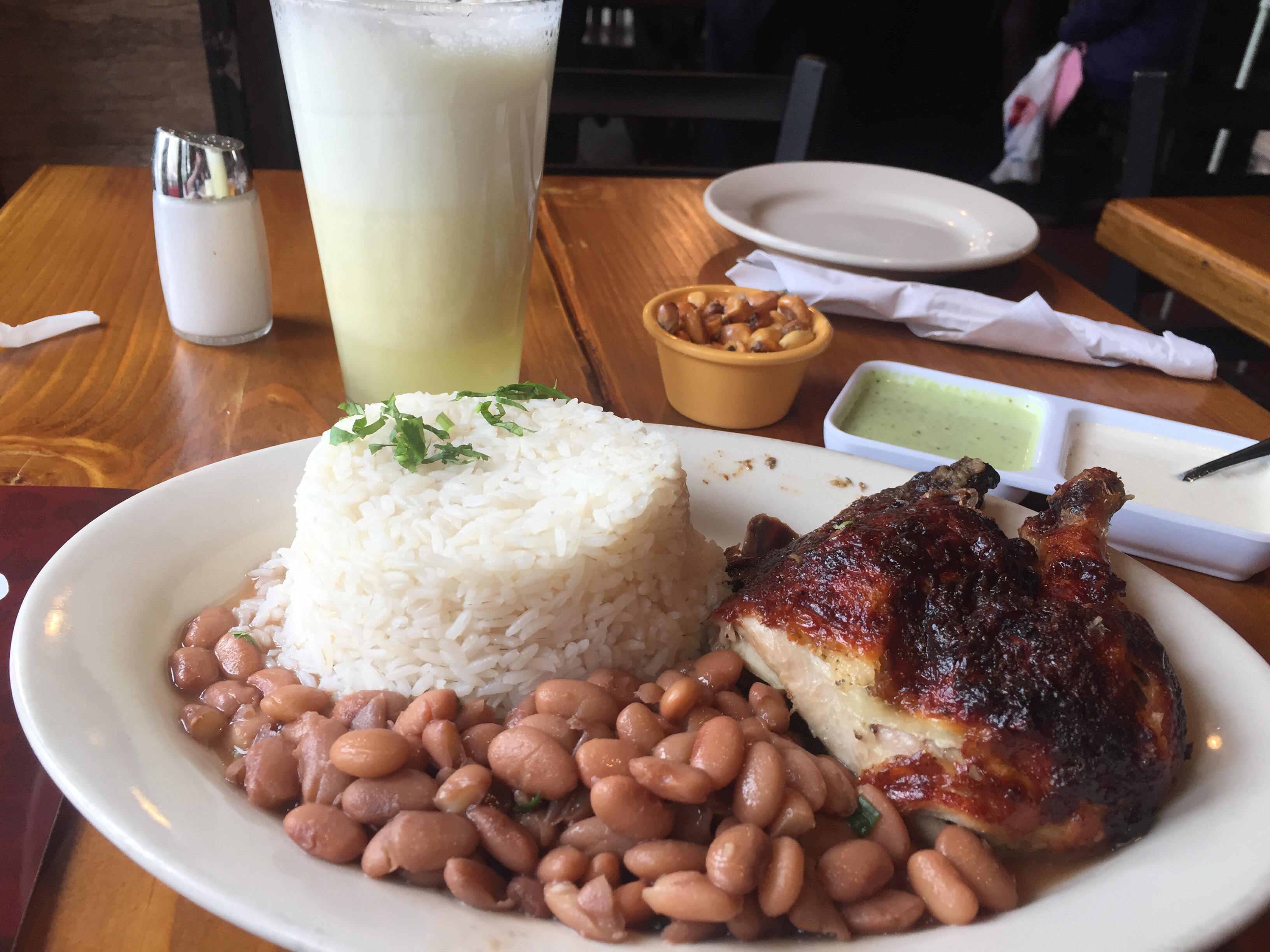 Results of the humble representative from Peru: it’s damn good rotisserie chicken! A 1/4 lb chicken lunch with a side of arroz y frijoles (= rice and pinto beans), or papas fritas = French fries with a green salad for $5.50.