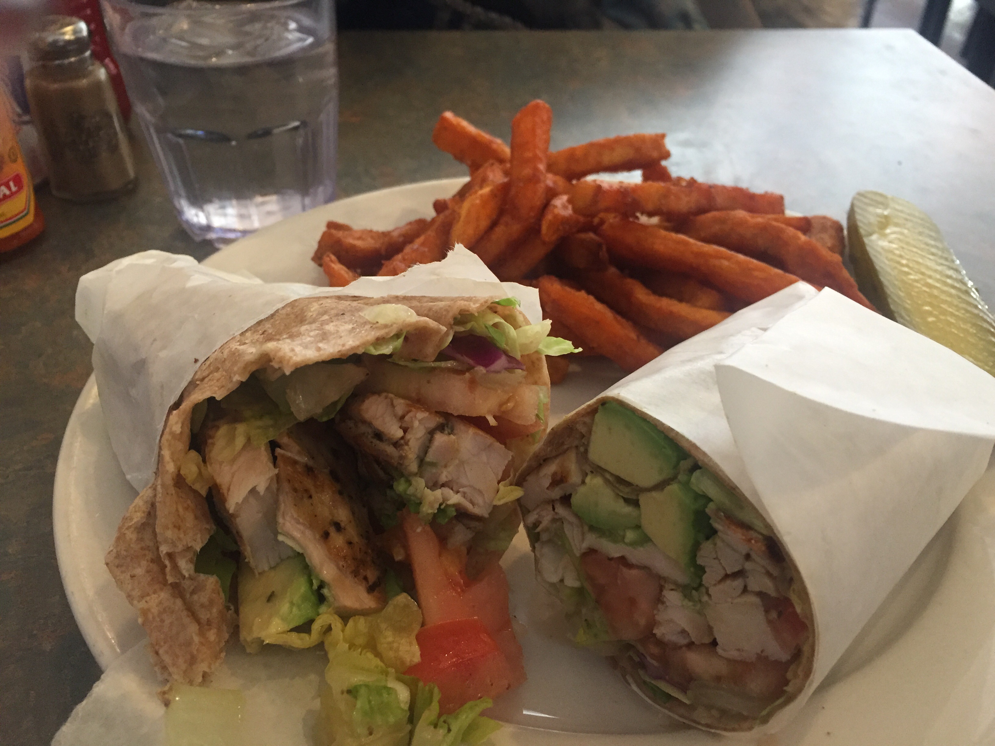 After tasting it, I realized why I never order grilled chicken salads: They taste boring. Cholo hot sauce couldn’t save this wrap, and neither did the sweet potato fries. (Again, I ordered them for health reasons…)