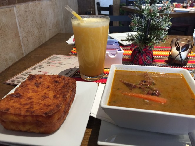 I ordered three small items: 1. the Soup-of-the-Day: The Beef and Bean soup = Kumanda S’o, 2. Sopa Paraguayan, a native bread, and 3. Fresh peach juice = Jugo de Durazno.