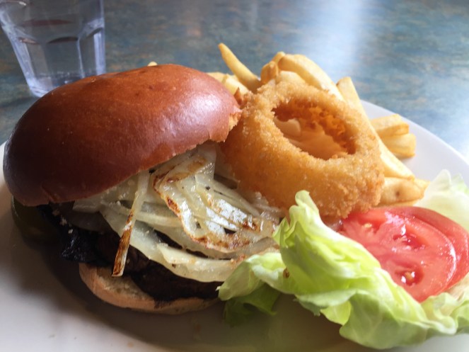 The Van Dam Diner was quieter as usual. No matter…I sat in back booth, alone with my thoughts. Luckily, I picked a winner of a lunch: a marinated portobello mushroom burger (sans cheese) deluxe, which included a sour dill pickle (way too sour, folks!), French fries, sautéed onions, tomato & lettuce, and a bonus onion ring!