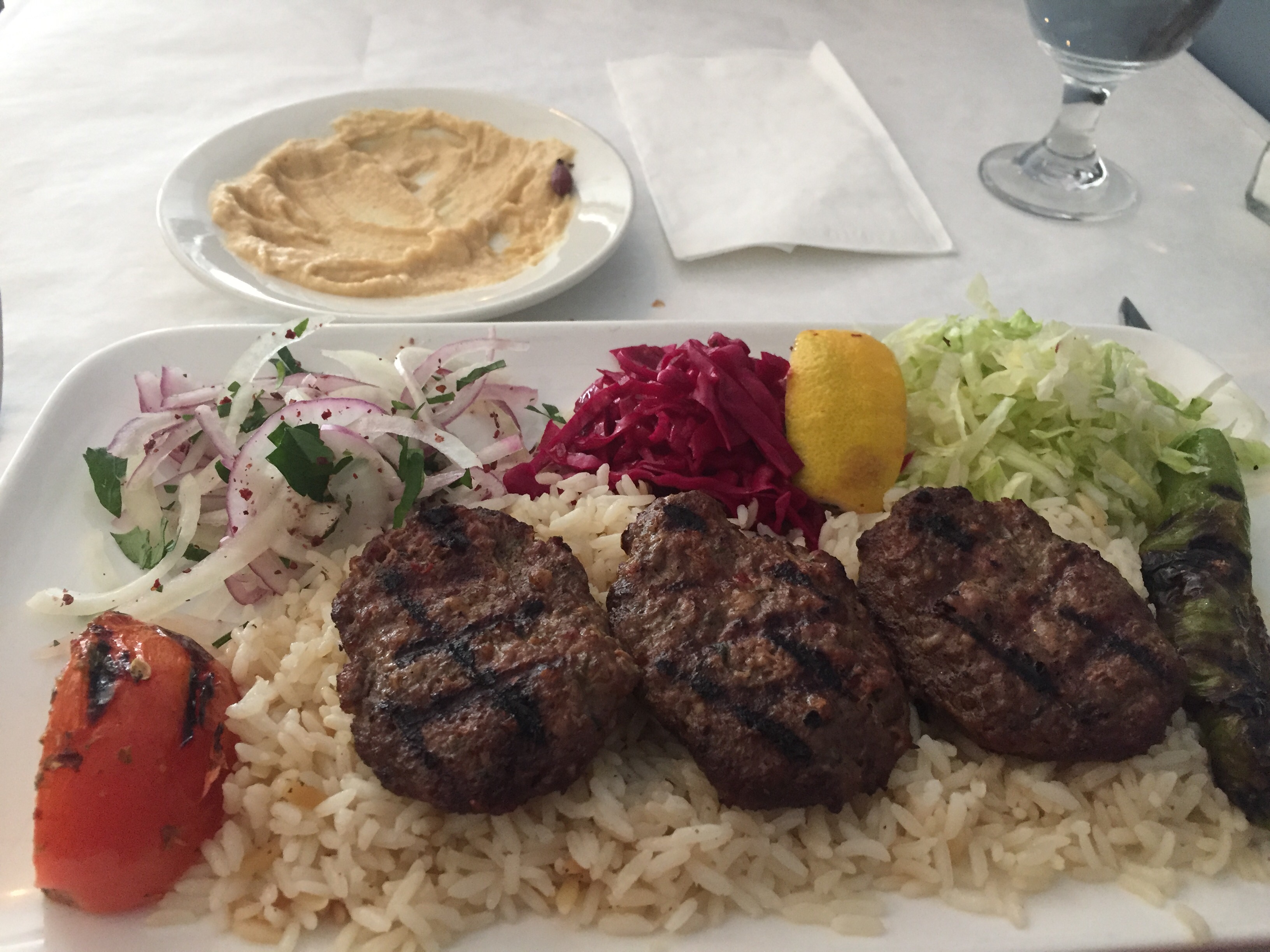 My lunch entrée was the Kofte Kabab (flattened lamb meatballs flavored with onion and parsley) with grilled tomato and green peppers, and side garnishes (chopped red and white onion and parsley, red cabbage, lettuce and a slice of lemon) on a bed of rice. The lamb was grilled nicely with a good texture, its taste was excellent. The rice was perfectly made. I usually don’t care that much about rice when it’s not the mainstay of the plate, but this time I was pleasantly surprised; the char from the vegetables/meat mixed into the grains, making it even better. The vegetables were great as well. My favorites were the grilled tomatoes.