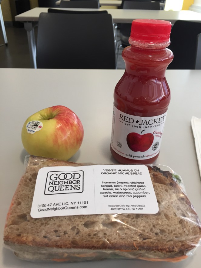 I didn’t notice until I unpacked my lunch at the break room (with the woman still screaming at the car outside about her love life), I had two apple-things, a Honeycrisp and a cold pressed Red Jacket cranberry-apple juice. (No problem. I now have a snack later…)