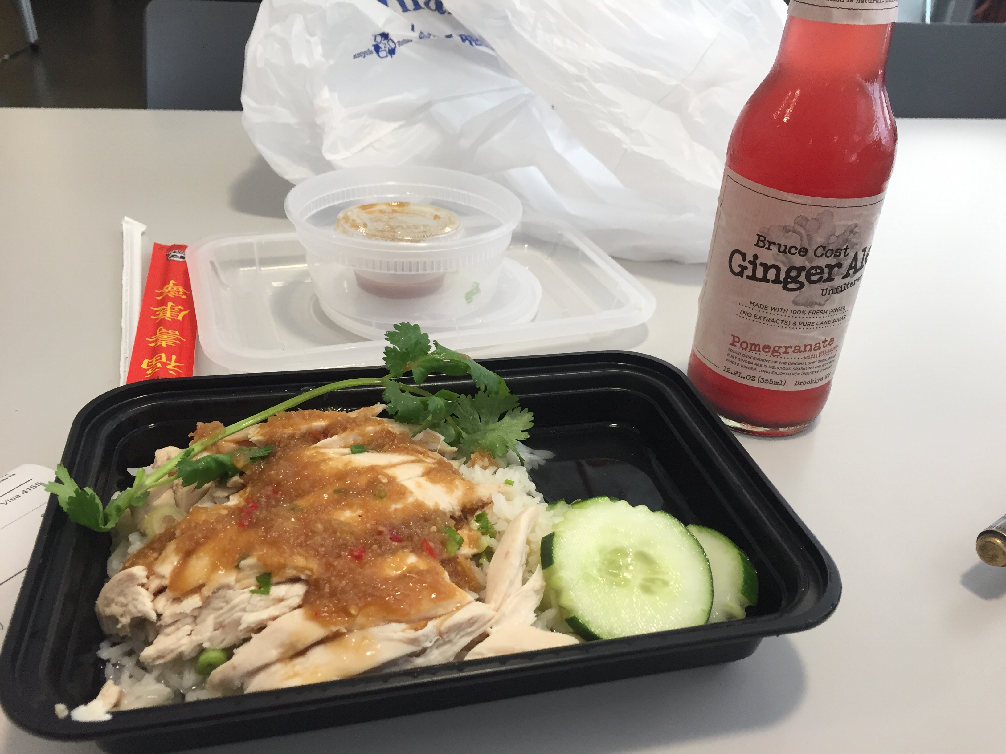 In lieu of soup, I chose the signature dish of Khao Man Gai NY: the Khao Man Gai, which is stewed chicken on rice, with a simple scallion-edged broth, and a spicy/sweet/sour/vinegary tamarind sauce with a few types of peppers, with s fresh cilantro garnish. For a drink, I chose a Bruce Cost unfiltered pomegranate ginger ale (with hibiscus).