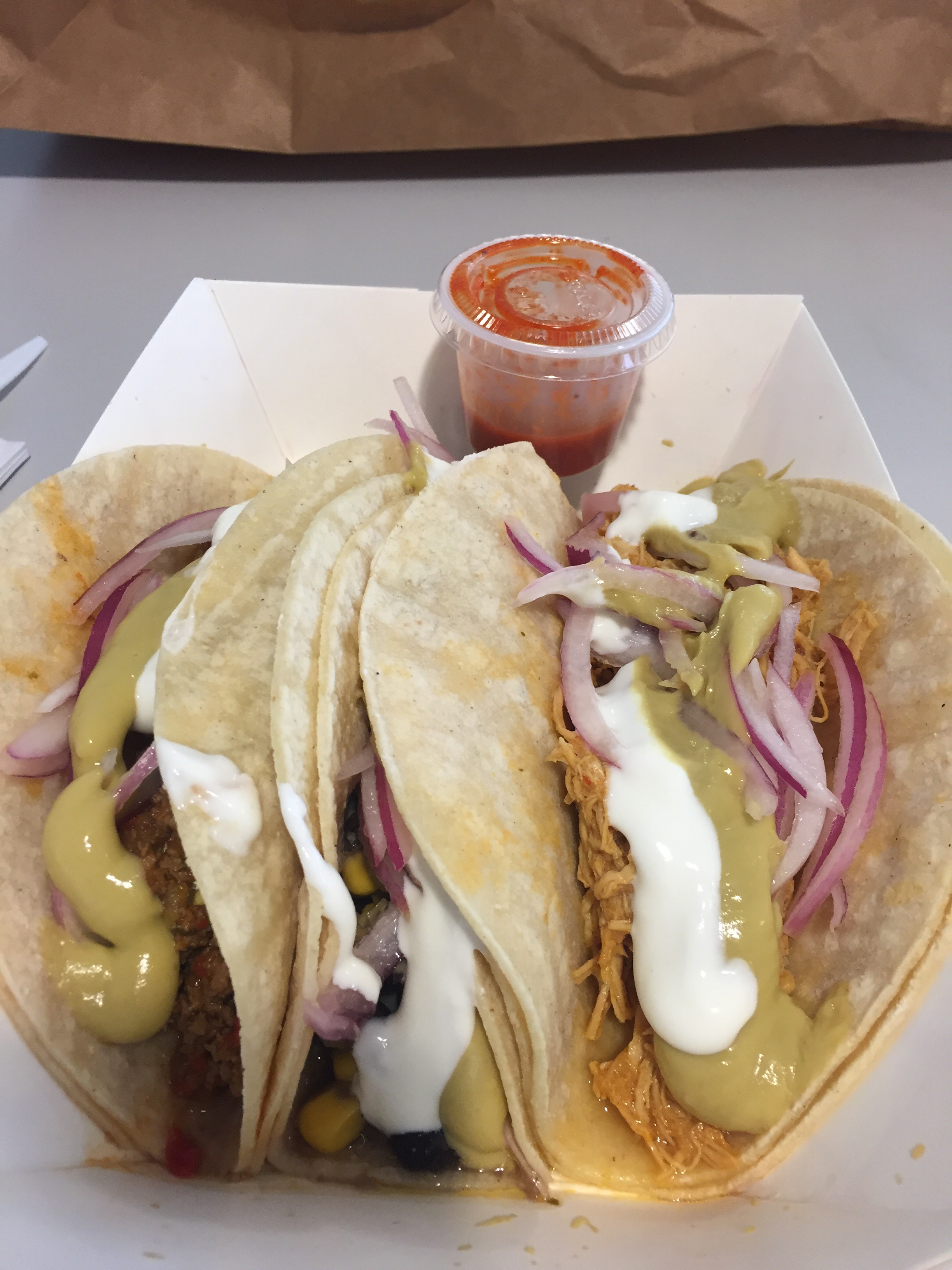 Their taco special comes with three kinds of tacos: stewed and shredded chicken with a spicy sauce, sofrito beef, and vegetables (black beans, corn and cauliflower), all with corn tortillas, red pickled onions, “special” guacamole (it really wasn’t that special, it was cream consistency out of a bottle), and creama, or sour cream, with a side of hot sauce.