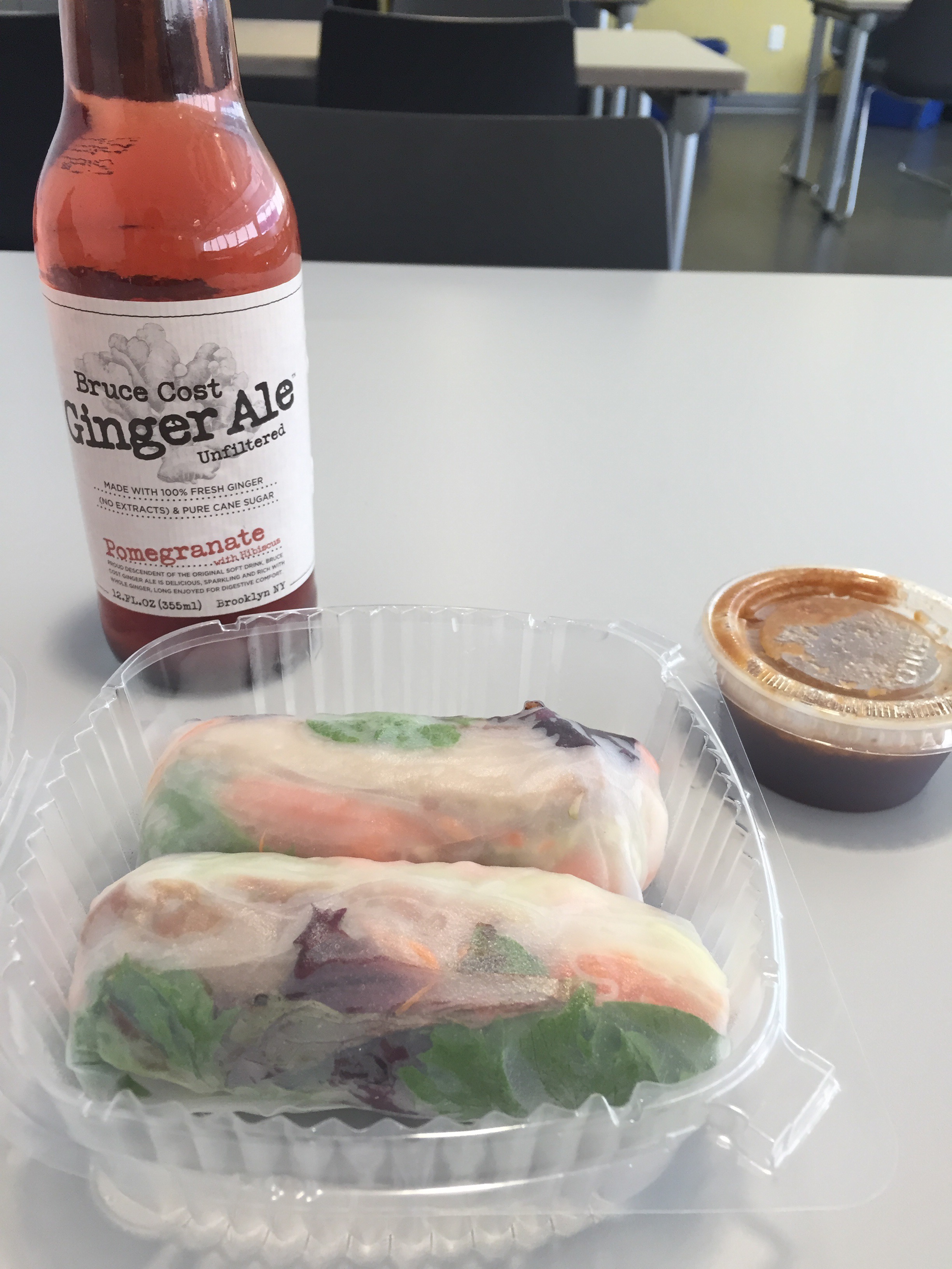 I ordered two chicken Spring rolls with a Bruce Cost Pomegranate ginger ale (Total cost: $7.50).