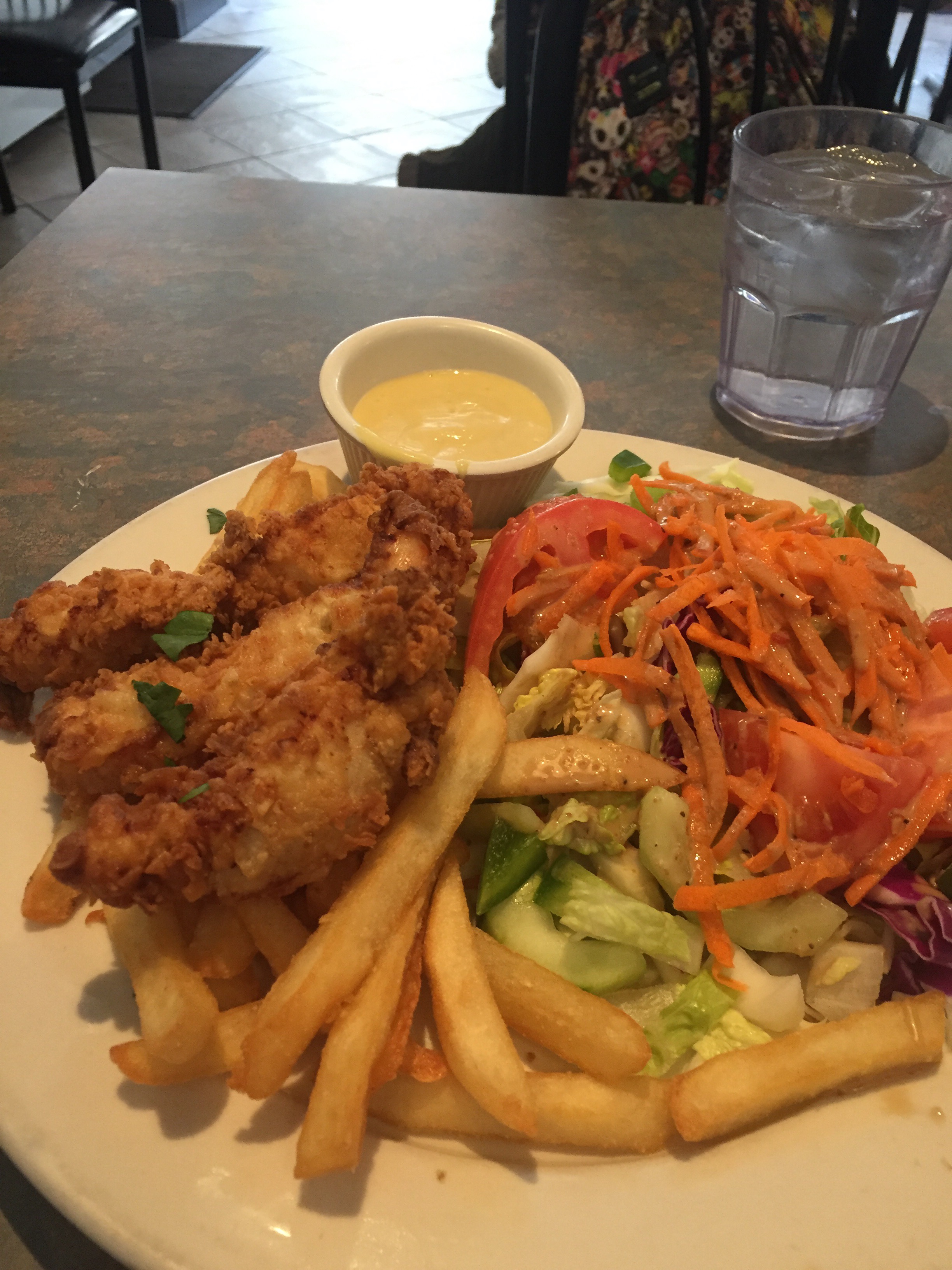 Today, I ordered chicken tenders deluxe, including a side salad and French fries, with a honey mustard sauce on the side. Amazingly, the plate was not overtly ample, and both the fries and chicken were freshly fried, so they were still good and warm.The side salad, was full of roughage, and was just okay.