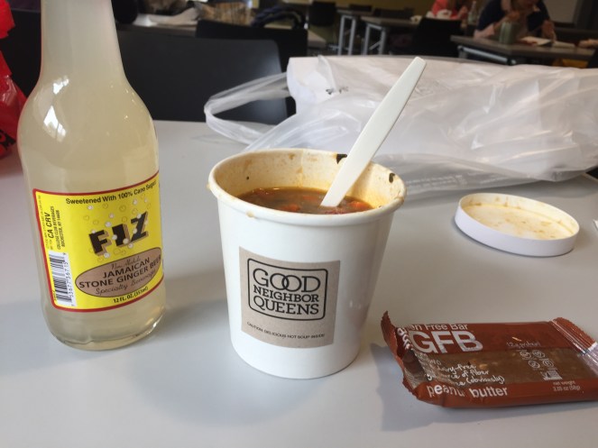 Not today, not yet. I have to settle on soup. Luckily, the hot soup special today at Good Neighborhood Queens is lentil soup, filled to the brim with lentils, tomatoes, carrots, onions, greens and spices. It’s a bit watery, but the overall flavor is robust and satisfying, not too salty.