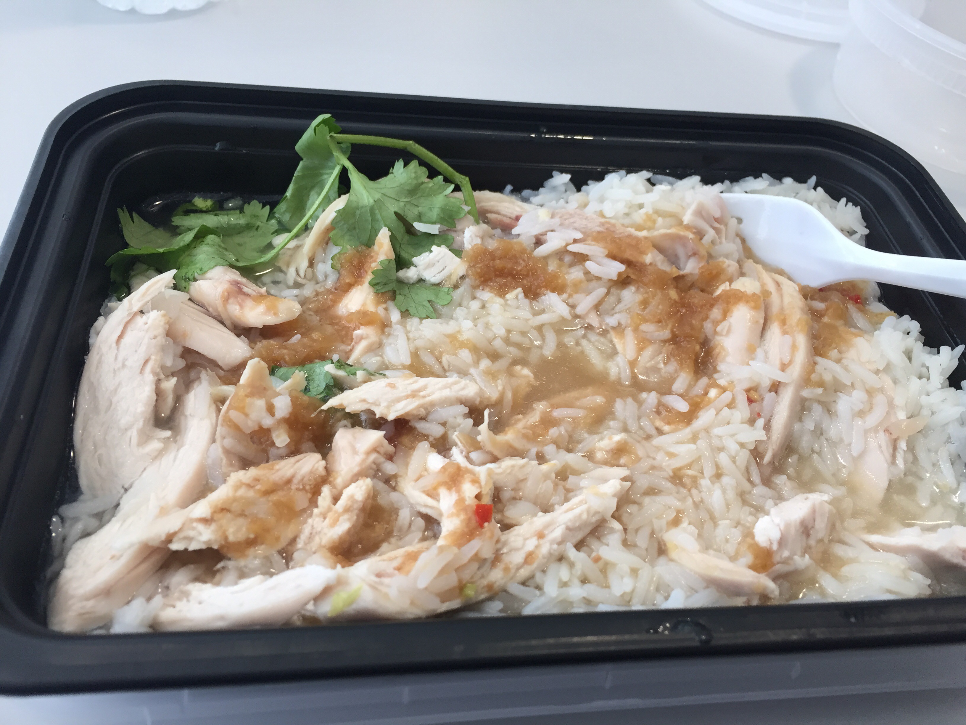 Anyway, I saved the best gluten-free lunch for last: The Khao Mai Gai, or Thai chicken with rice: simmered chicken with jasmine rice and its clear broth, scallions, cucumbers, cilantro, and a tamarind-based sauce with 4 points of Thai seasonings: salty, sweet, sour and spicy.