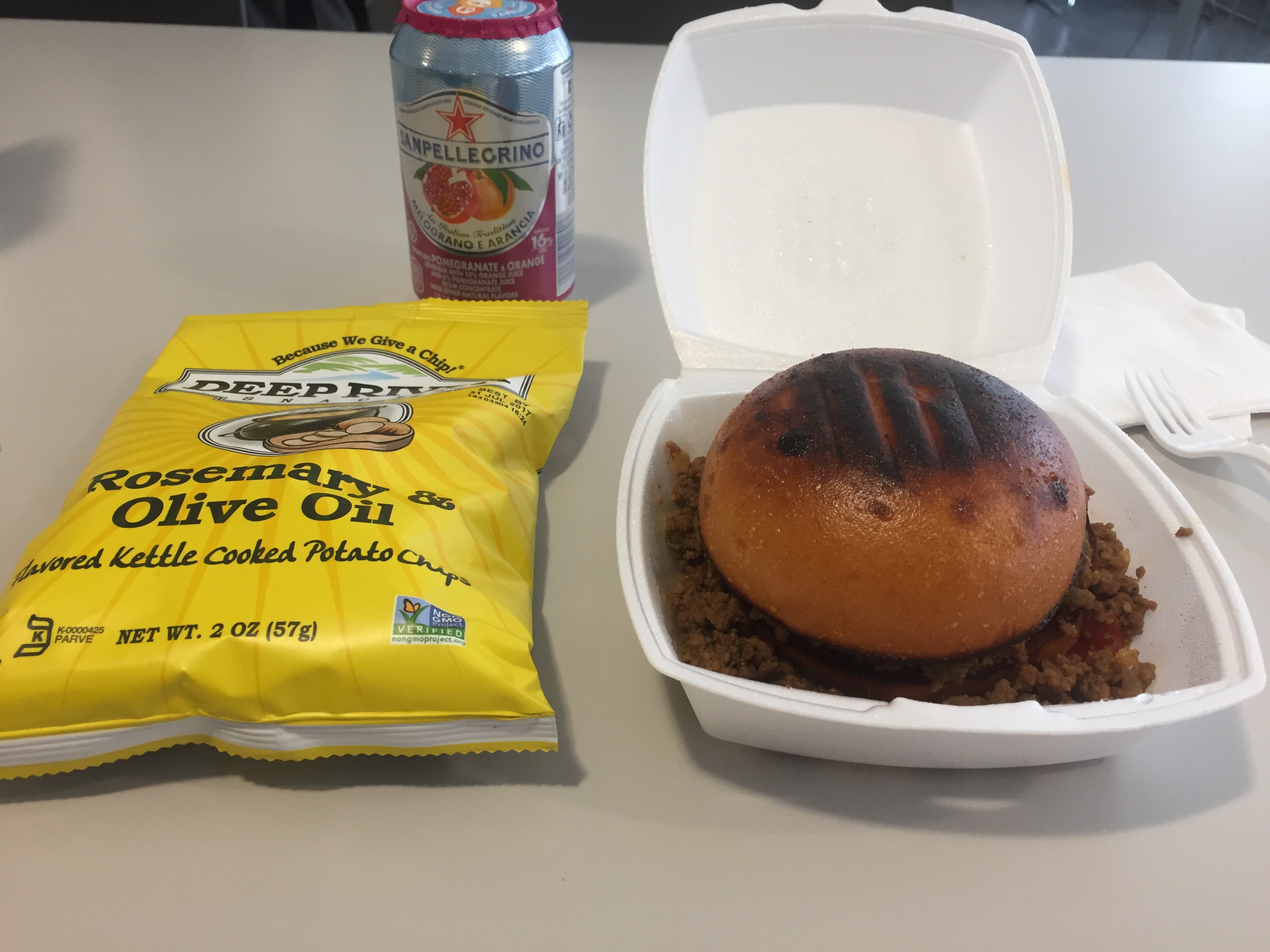 The accompaniments are pretty good; the The Deep River potato chips were dusted with olive oil and rosemary (delish), and the Pellegrino sparkling water was flavored with pomegranate and orange juices. Very refreshing.