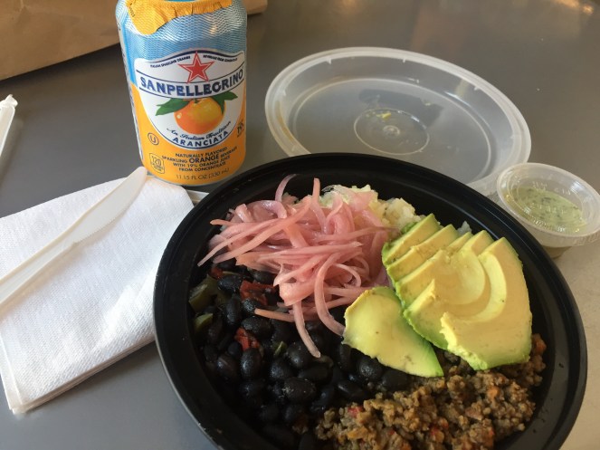 However, Don Tapas was my savior today. Their daily special is Bululu Bowl: ground beef seasoned with pimentos, pickled red onions, sliced avocado, black beans and sweet plantains, served on Latin white rice, with a side of cilantro aioli. (I ordered mine without the plantains.) I chose San Pellegrino sparkling orange-flavored = Aranciata water to drink with the bowl.