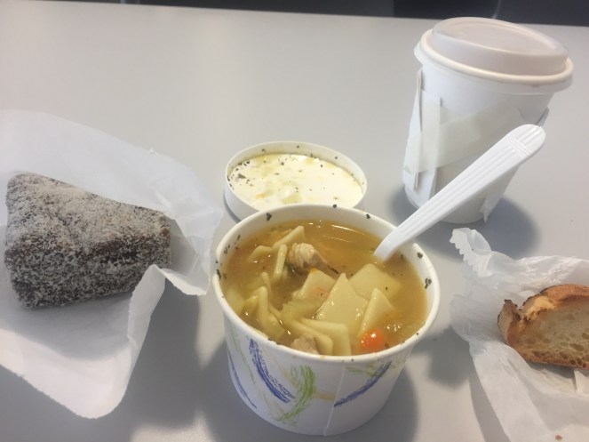 Sans Bakery (next door to Don Tapas), sells freshly gluten-free items, and brewed hot tea. I decided on chai tea with almond milk (it was just made, very hot! and delicious) and a lamington cake, native to Australia. It’s a two-layered white sponge cake with a thin raspberry jam filling, covered with chocolate syrup and dusted with coconut.