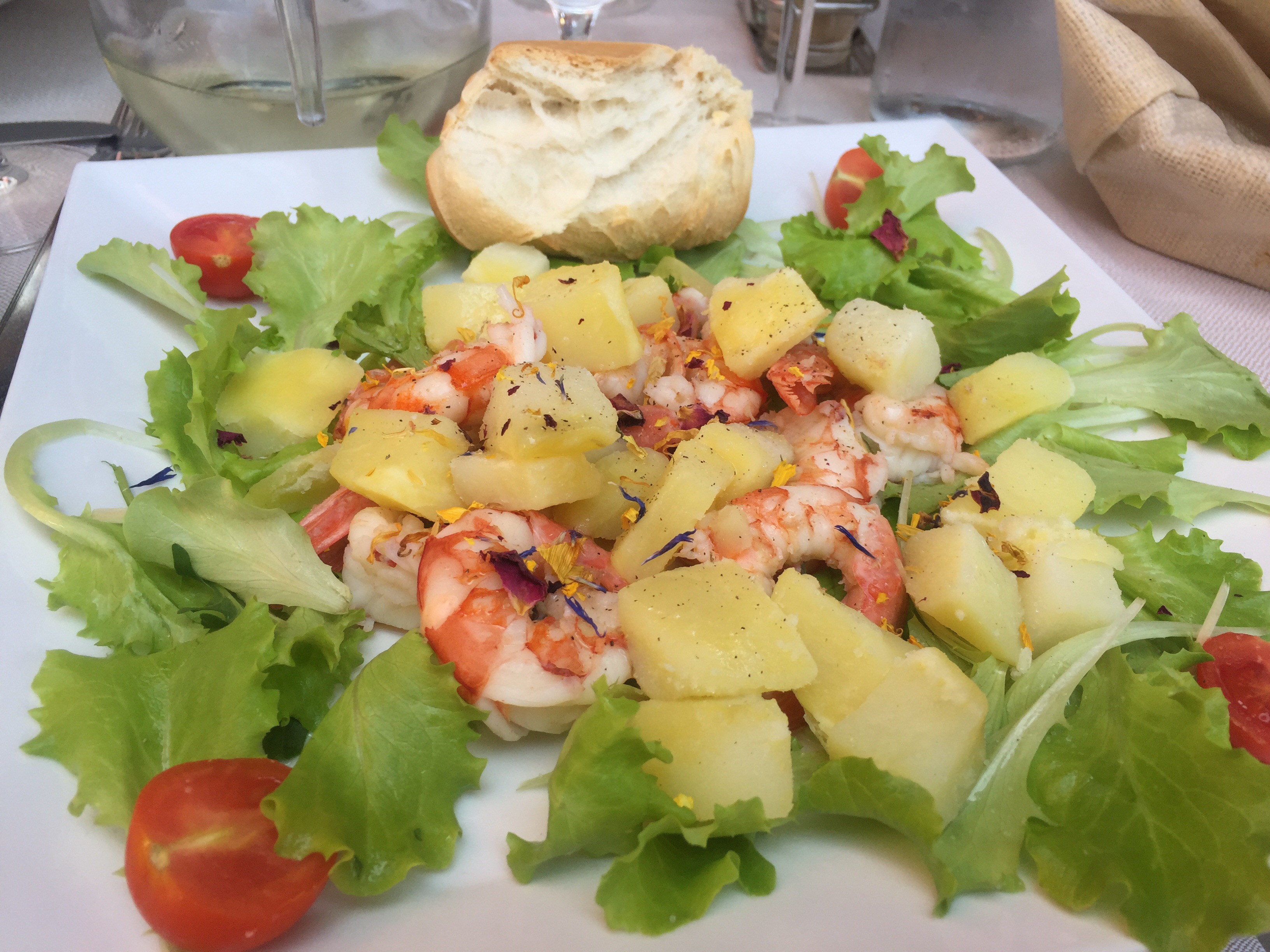 The prawns (shrimp) were excellent, very succulent. They were served on a bed of greens with slices of boiled potatoes, which I wasn’t expecting to see on an island menu. The edible flowers were a nice touch. Very clean taste, very nice presentation.