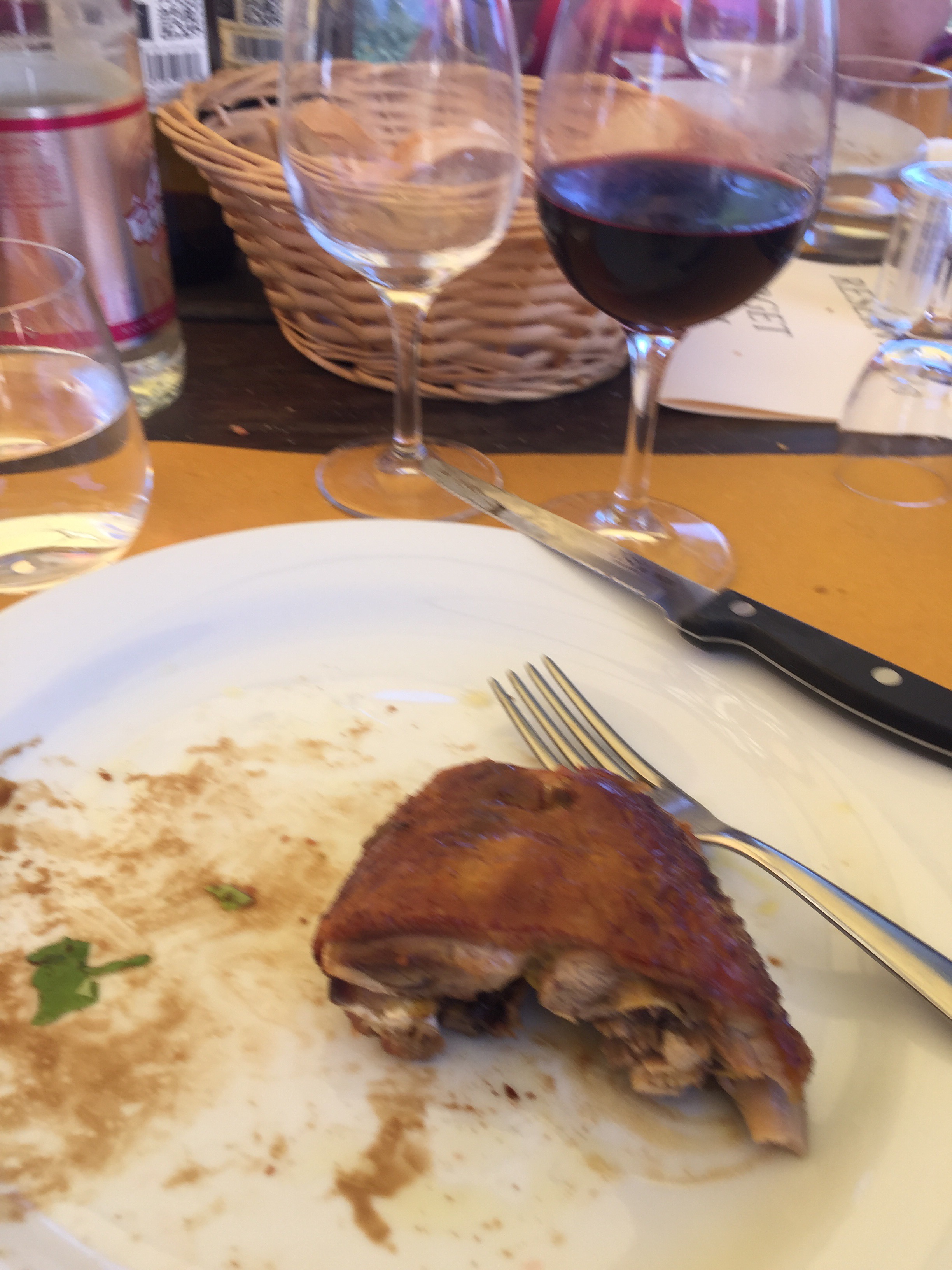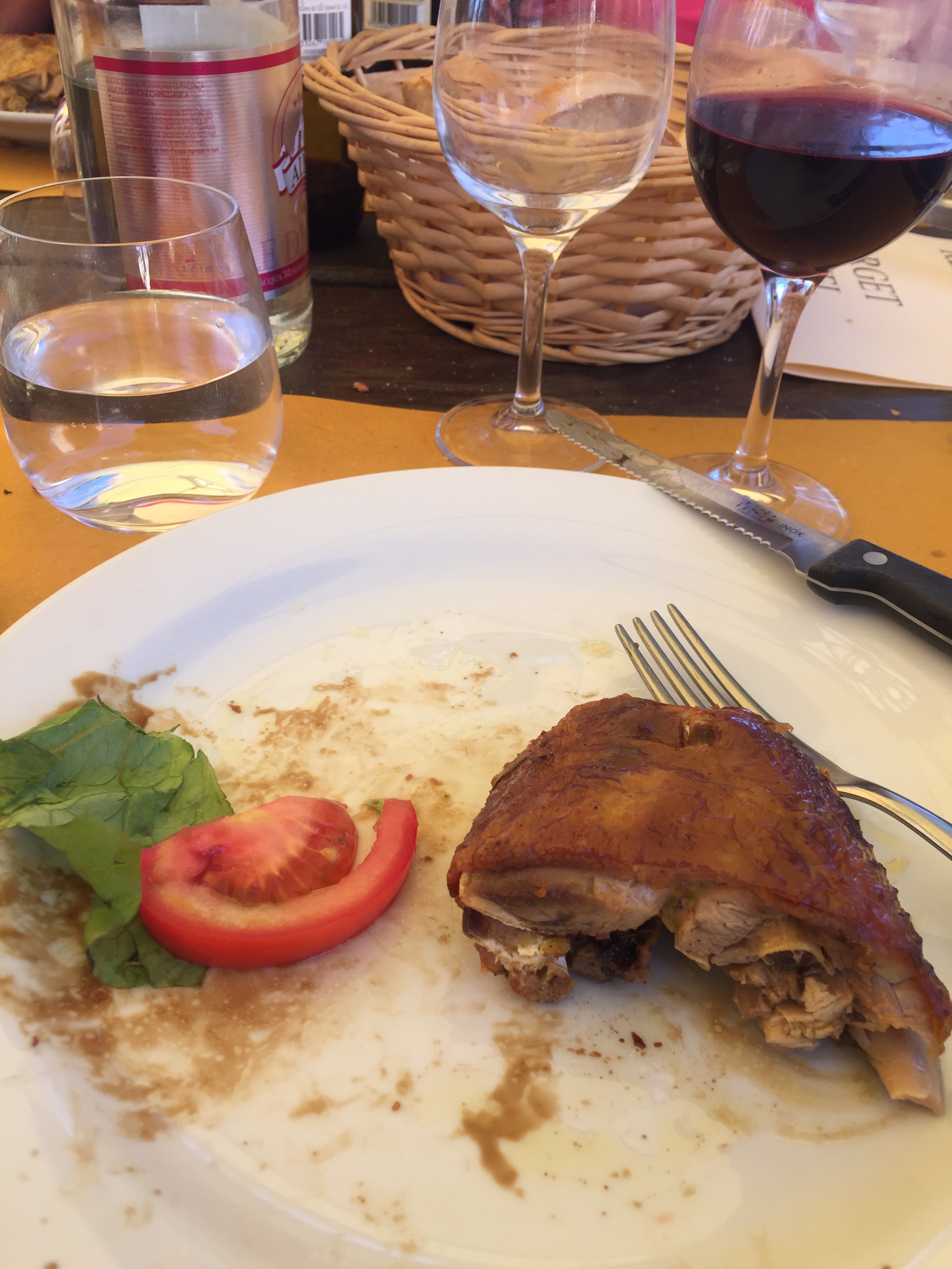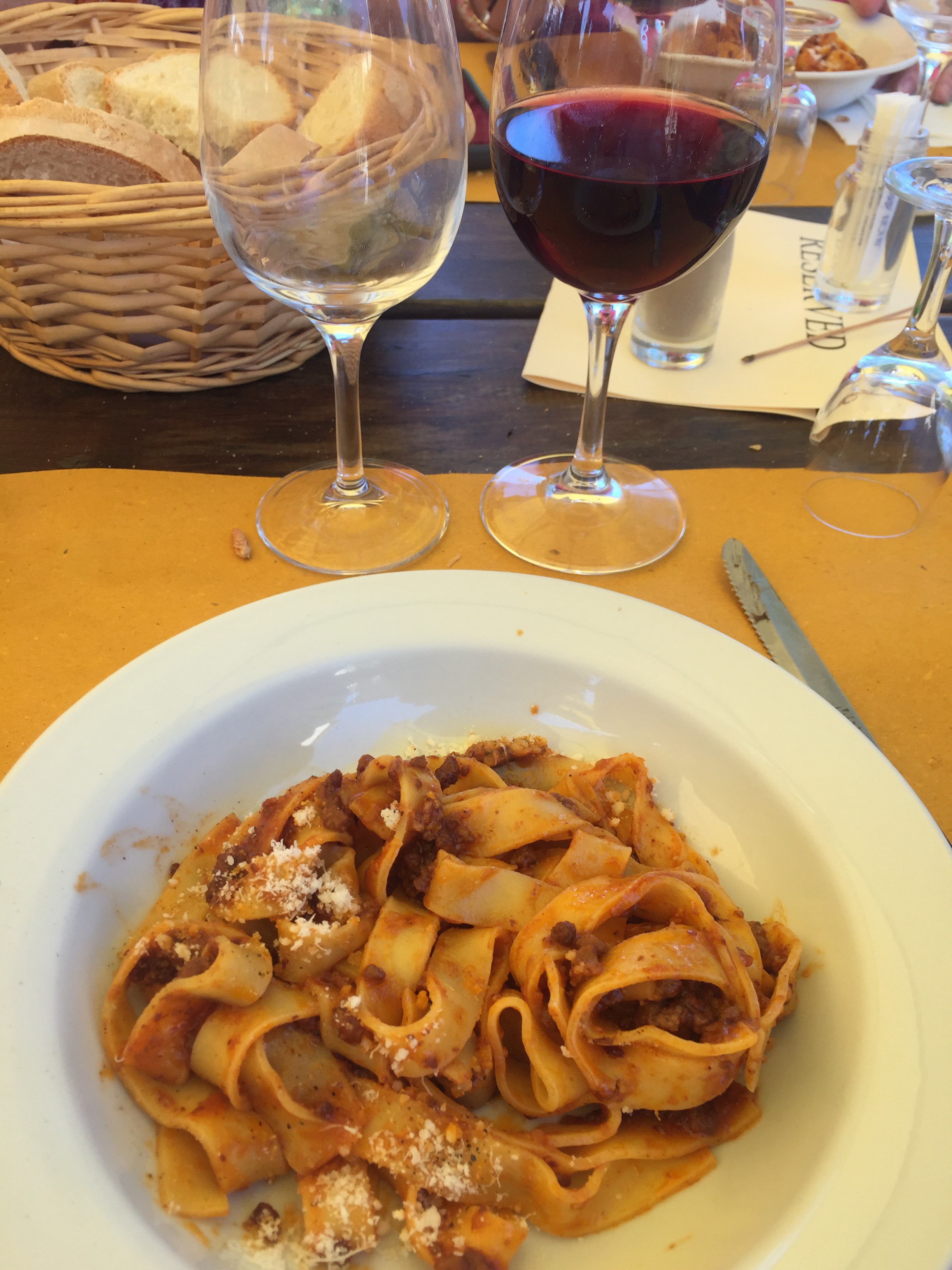 The primi platti (first course) was fettuccini with beef and tomato ragu ; the noodles and the beef were made here. Peccerino cheese on the side. A nice 2015 Chianti rounded out the pasta course.