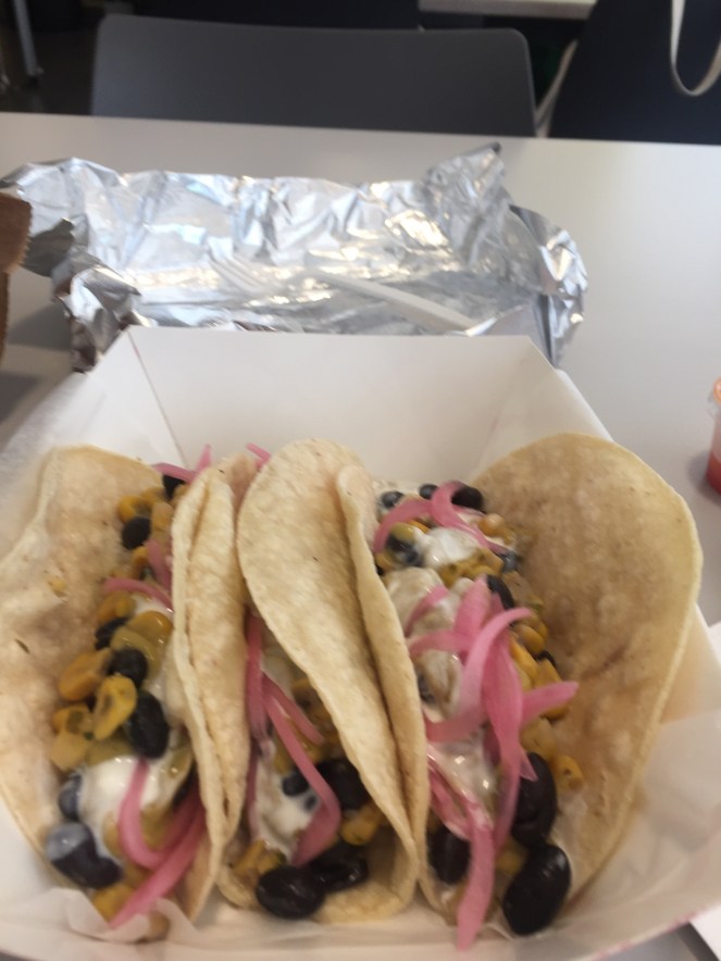 Today’s lunch is tacos, which is timely and awesome. My pick at Don Tapas today was three Veggie Fiesta tacos: black beans, corn, crema (but no cheese), pickled onions, and guacamole special (not really that special, actually…) with hot sauce, on soft corn tortillas.