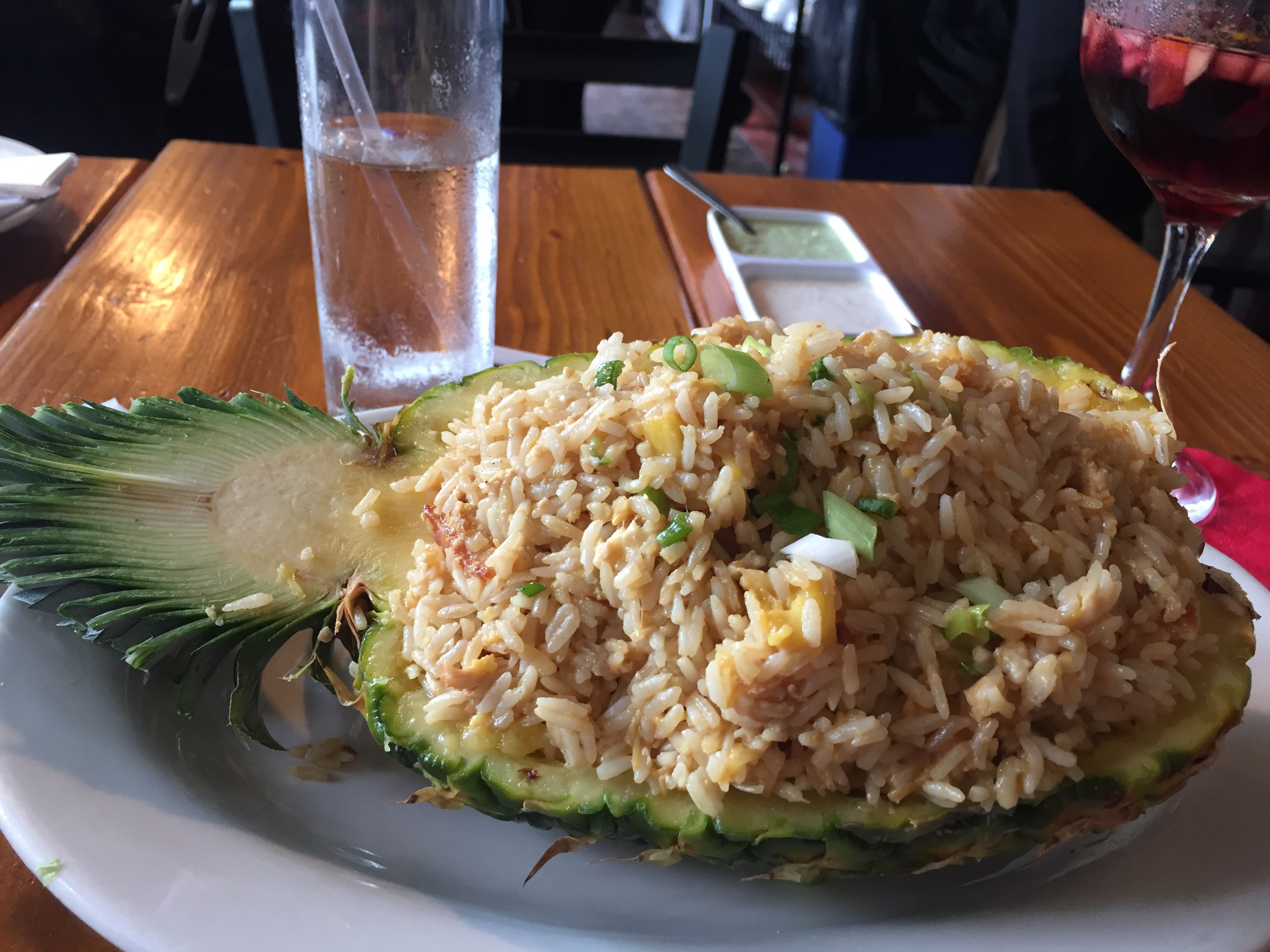 At Riko’s, one is never angry. Yes, there’s no cold air here (muy caliente!), but the sangria is working its magic upon me. And…the Peruvian pineapple fried rice!
