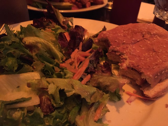 Dinner needed to be quick and somewhat cheap. We settled for Mullanes Bar, an Irish pub nearby BAM. Their long menu of late night sandwiches seemed promising, the prices were fair and middling, but still costly like burgers sold in Manhattan. I settled on the Salmon burger with side salad ($15), my friend ordered the blue cheese burger ($13).